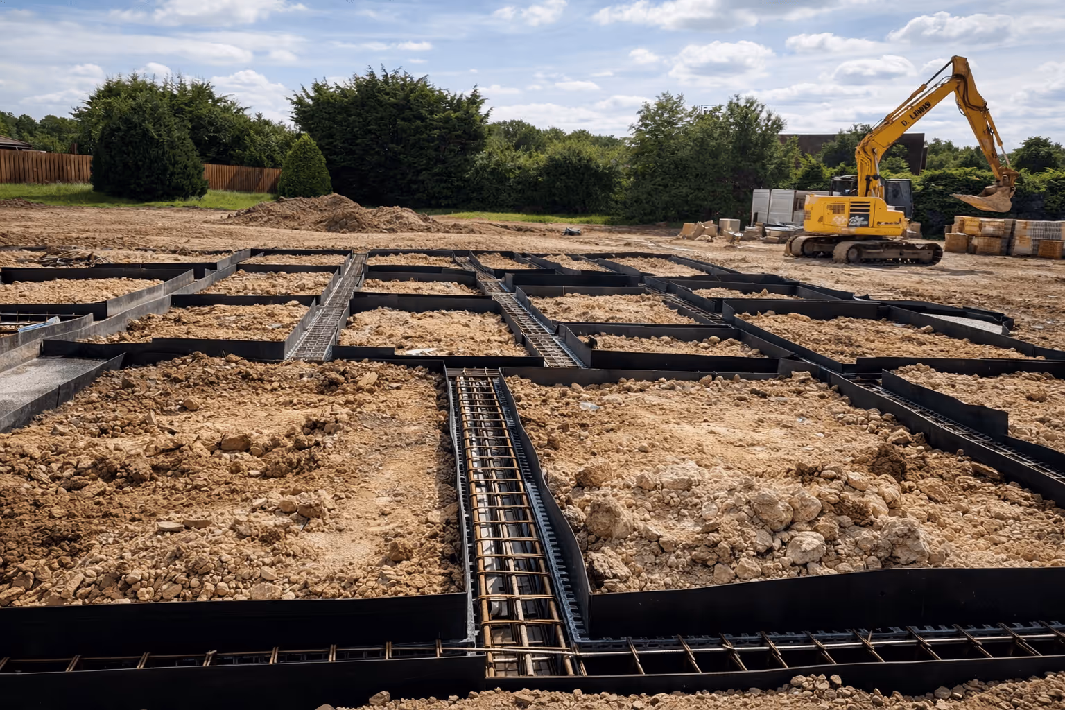 We specialise in reinforced concrete foundations, ground beams, pile caps, raft slabs and complex foundation systems designed to support demanding structural loads. Whether working on new build developments, apartment schemes or commercial projects, our approach is methodical, controlled and compliant with current regulations.